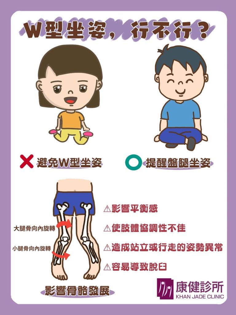 對於先天性髖關節發育不良或髖關節不穩定的孩童來說,更可能導致脫臼,應該盡量避免「W型坐姿」。
