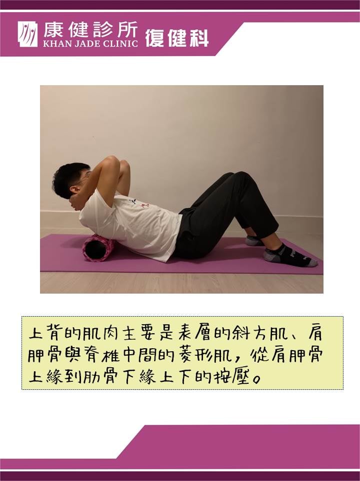 進行上背滾筒按摩時可以伸展胸椎,執行動作時要收下巴,背抵著滾筒往後躺,然後分段進行。